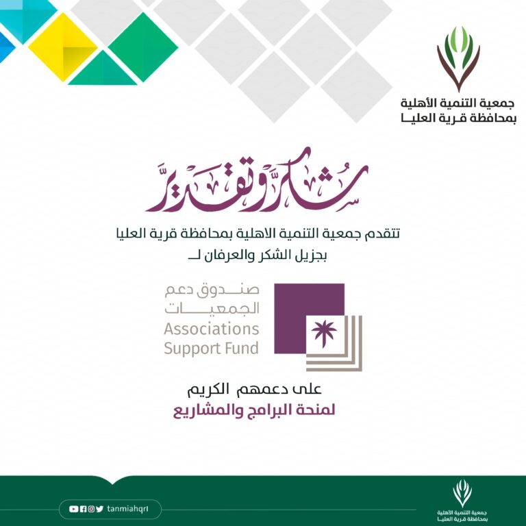 منذ ان انطلقت لجنة التنمية بمحافظة قرية العليا وقد اخذت على عاتقها خدمة هذا الوطن المعطاء وكان شعارها الذي كان وما زال نبراسا لجميع العاملين (تنمية ونماء) ونحن نعي ان هذه القاعدة تحتاج الي مزيد من العمل والجهد للوصول الي رؤيتنا التي اطلقنها (الريادة والتميز في برامج التنمية الاجتماعية) من هنا تأسست لجنة التنمية الاجتماعية الأهلية بمحافظة قرية العليا تحت موافقة من وزارة العمل والتنمية الاجتماعية في تاريخ 23/9/1437 ترخيص رقم 510. وفي العام 1443 تحولت الى جمعية اهلية صدرت شهادة التسجيل للجمعية برقم (4042) وتاريخ 1443/8/26