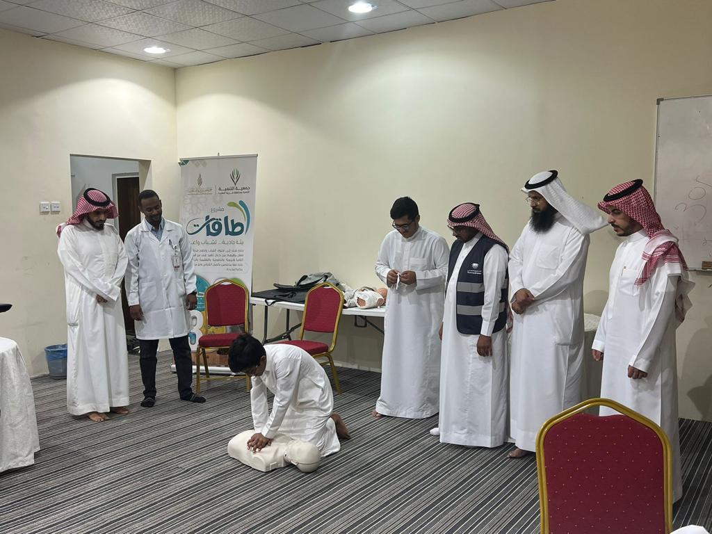 بالشراكة مع مستشفى قرية العليا قدمت جمعية التنمية الأهلية برنامج الاسعافات الأولية للمشاركين في برنامج طاقات الشبابي وقدم البرنامج الدكتور مؤيد عبدالعظيم القاسم في مقر الجمعية بمحافظة قرية العليا